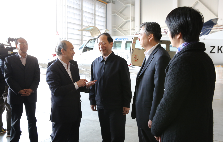 石泰峰一行(háng)首先登(dēng)上了由宇航自行設計、改(gǎi)裝的CRJ—200公務機,參觀了駕駛艙、客艙,了解飛機內部構造和改裝創新過程。隨後來到宇航(háng)機庫(kù),實地考察並詳細了解(jiě)了宇航的發展情況和戰略規劃。